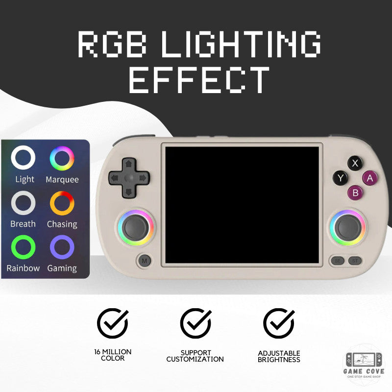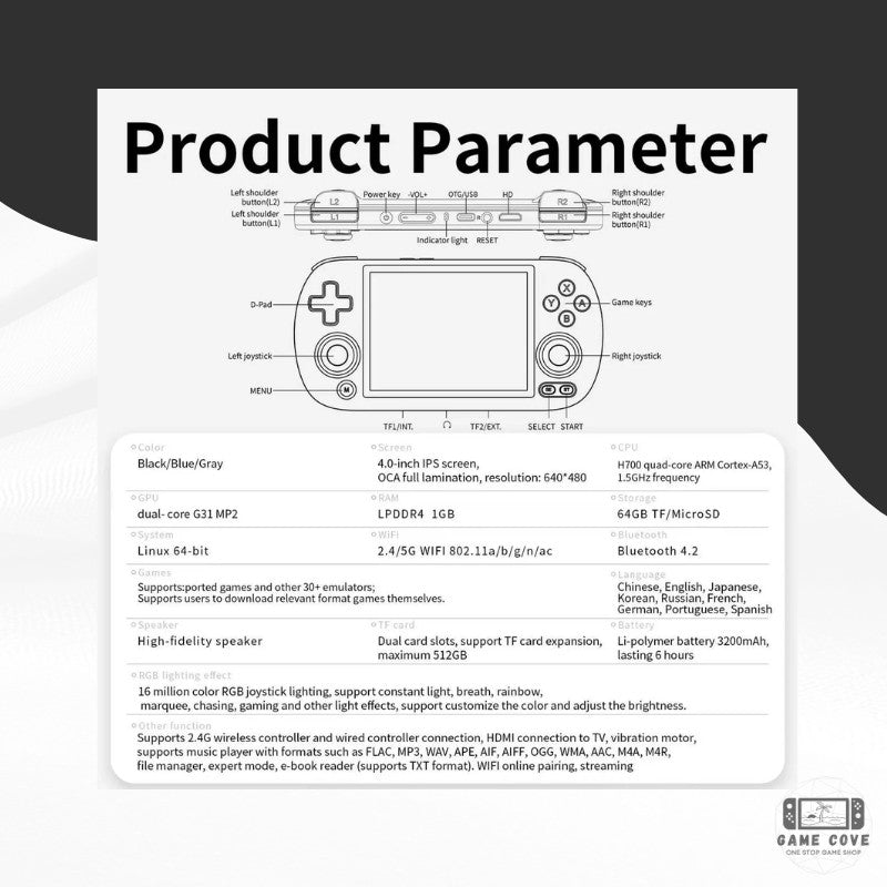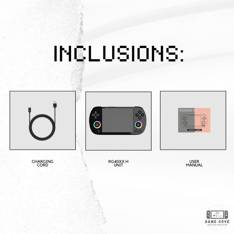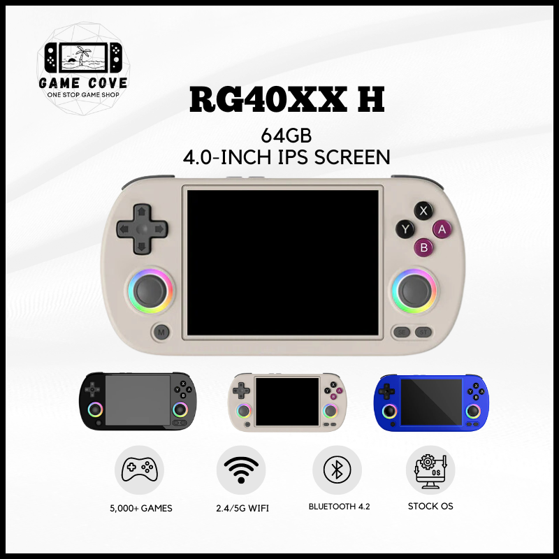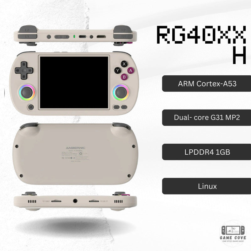 Meet the expert designed Anbernic RG40XX H, a powerful game console with a 4.0-inch IPS screen, 1.5GHz quad-core CPU, and 1GB RAM. Enjoy over 16000 games with a 256GB TF card and dual card slots. Experience customizable RGB lighting, 2.4G wireless controller support, and HDMI connection to TV. Includes console, USB charging cable, and user manual.