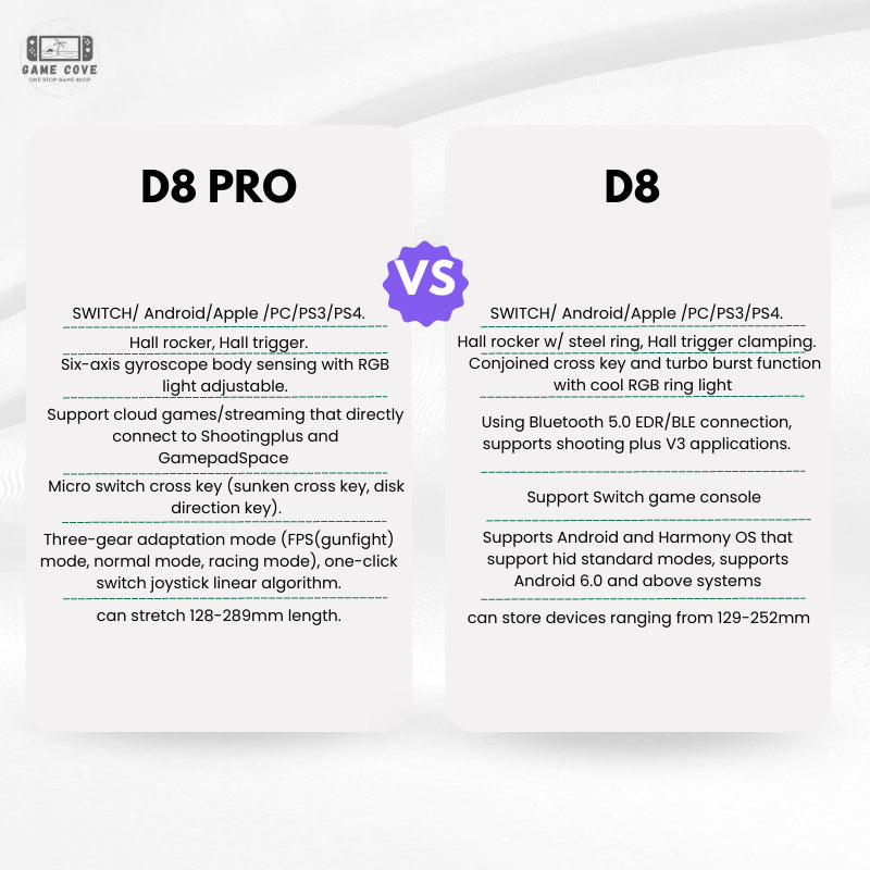 The BSP D8 Pro Controller offers versatile compatibility with multiple platforms, including SWITCH, Android, Apple, PC, PS3, and PS4. With advanced features like macro programming and six-axis gyroscope body sensing, along with HD double vibration motor and customizable RGB lighting, this controller is the ultimate tool for gamers. Its three-gear adaptation mode and one-click switch joystick linear algorithm ensure optimal performance in any game. Plus, it allows for easy stretching of mobile phones, tablets, and Switch devices for a comfortable and personalized gaming experience.